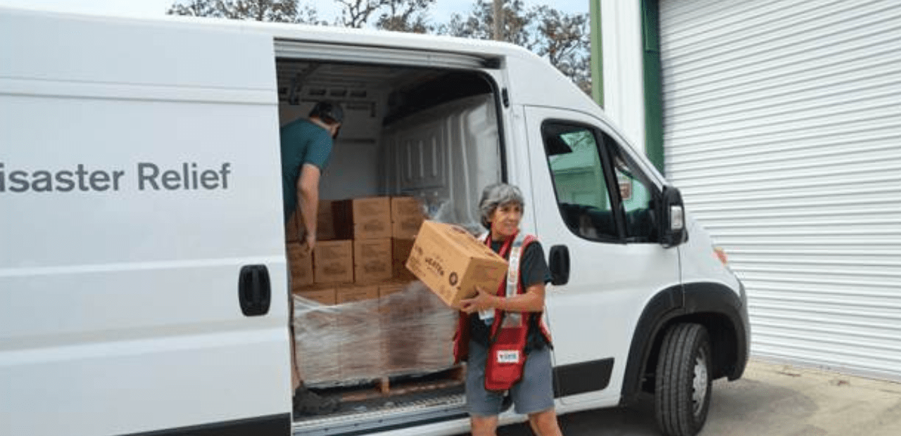 (Pictured above) Leaders and associates distributing hot meals and supply kits at the St. Petersburg home office on October 15.