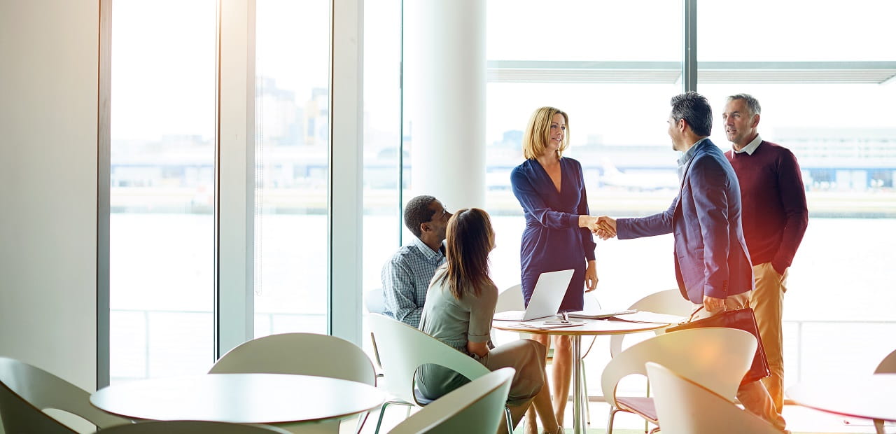 Handshake between two professionals in business attire.
