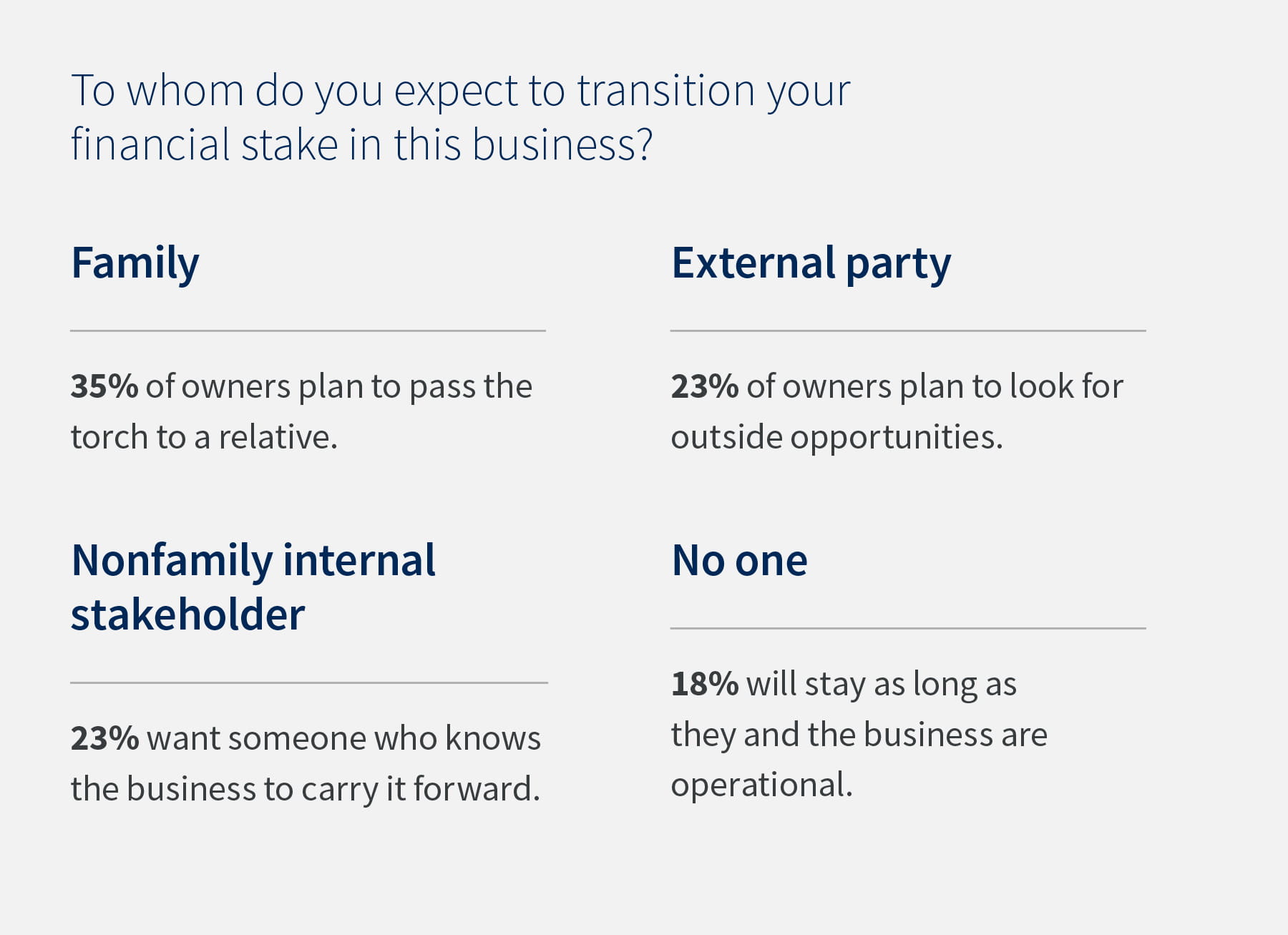 Transitions to internal stakeholders represented 23% of responses, the same percentage who expected to sell to an external third party. Another 18% indicated the business would not change hands; the owner would stay as long as it was operational.