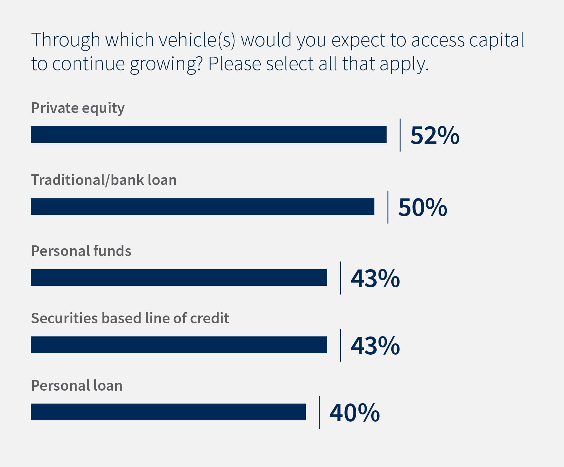 About seven in eight respondents expected to need outside capital to fuel a business expansion. Asked to identify all avenues through which their business would access growth capital, respondents put private equity (52%) at the top of the list, slightly ahead of traditional/bank loan (50%), personal funds (43%), securities based line of credit (43%) and personal loan (40%).