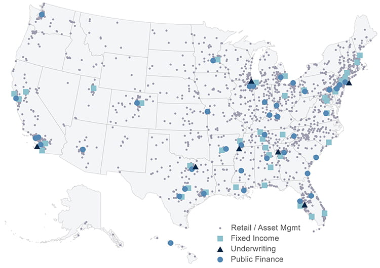 Our powerful distribution platform stretches from coast to coast. And with 40 public finance office locations, our team of approximately 180 professionals helps client issuers build communities and finance progress nationwide.