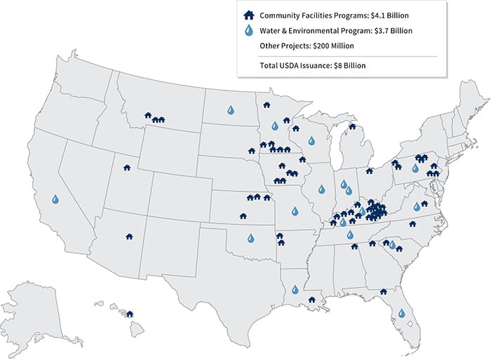 The following map illustrates our partnership with USDA borrowers across the country on more than $8 billion in financings. View transactions highlighting our team's USDA experience below.